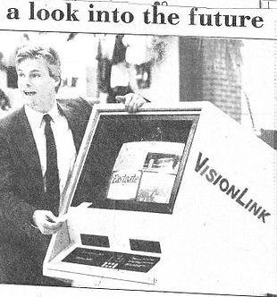 Zim poses in front of a television, demonstrating the VisionLink Internet system designed for home use.